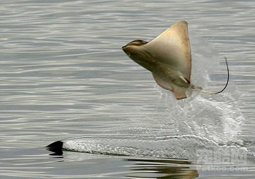 這條黃貂魚正想盡一切辦法,試圖避開素有深海“終極殺手”之稱的逆戟鯨的追逐,而后者緊緊跟在黃貂魚的身后,隨時準備展開攻擊,最終迫使黃貂魚飛出水面。黃貂魚似乎對藏身海底的生活極為滿足,偶爾還用它們銳利的尖刺去襲擊人類,而這張照片則表明,情急之下,黃貂魚照樣可以表演飛行絕技。