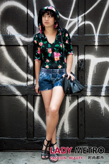 玫瑰花圖案的連帽襯衫搭配牛仔熱褲,以及今年流行的羅馬涼鞋別有一番異域情調。