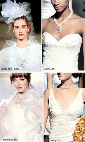 喜歡簡潔的新娘,頭頂花冠身披白紗,只需一枚璀璨的鉆戒,就足以讓她光彩照人。喜歡裝扮自己的新娘,也要切記一點“配飾宜少不宜多”,千萬不要把自己搞成“圣誕樹”,全身珠光寶氣,成為全場的“笑花”。