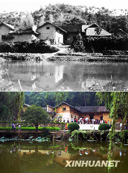 上圖為1950年拍攝的韶山沖毛澤東故居(資料照片);下圖為2009年9月4日,中外游客在毛澤東故居瞻仰參觀(新華社記者趙眾志攝)