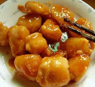 東北名菜拔絲蘋果是將切好的蘋果肉放在滾燙的糖漿里一過,撈出來金黃金黃的、熱騰騰的一大盤。趁熱用筷子夾起一塊,那還沒冷卻的糖漿就被拔成一絲一絲的,站得老高還不能把它們完全拔斷,單看那絲線就不由的淌口水了。這時(shí)配菜一起出的一碗涼開水起作用了,你把蘋果肉放在水里一蘸,糖漿絲遇冷而變脆了,放到嘴里,外面是甜而清脆,里面剛是熱而柔嫩,真絕了。