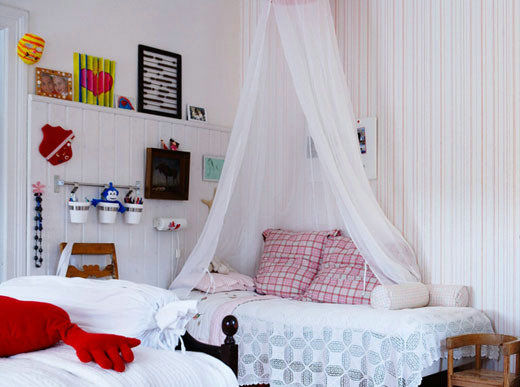 白色的床品和粉色的靠包打造出臥室里溫馨浪漫的情調,睡床上方的白紗垂簾和床裙邊的鏤空點綴等,這些清爽而有亮點的床品是小空間臥室的最佳選擇。