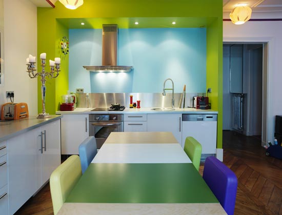 餐廚空間由藍綠色交替組成,輕快的色彩,歡快的氛圍,Matali Crasset打造了一個讓人身心愉悅又食欲大增的彩色空間。