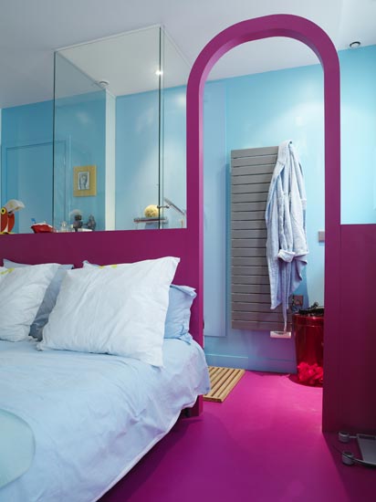 對臥室的期待和盼望,是從客廳的小覷中開始,一個充滿夢幻色彩的黃色門洞,就讓人有了向內部窺探的欲望,進入其中,大面積的粉紫色,可謂充滿了童話色彩,紫紅色的地面用色大膽,分隔衛浴間和臥室的隔斷墻更是別出心裁,延續了絢麗的紫紅色不說,還巧妙地設計了一道拱門裝飾,像童話故事中的城堡般美妙,也讓臥室更有層次感。