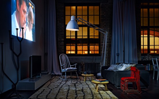 裸磚,雙層高度的天花板和巨大的黑色框架窗口創(chuàng)建出美好的工業(yè)空間,夢(mèng)幻般的真皮沙發(fā),驚人的窗簾和熱氣球似的燈籠創(chuàng)造出氛圍。