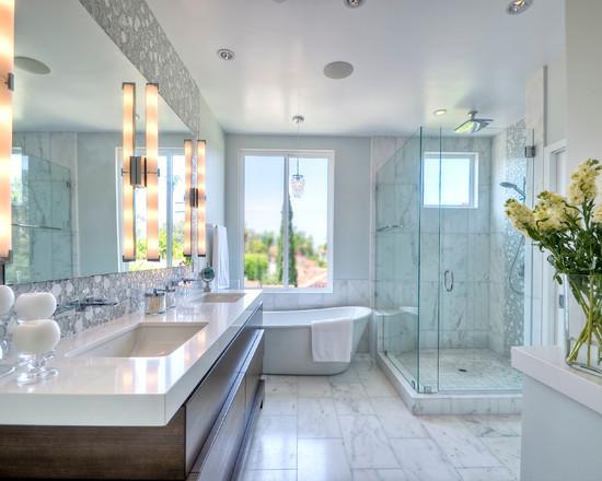 浴室中最理想的色調是粉色系,例如:粉紅、淡綠、淡藍及桃紅色等,淡雅的粉紅色搭配白色的潔具讓空間顯得流暢大氣。其次則是奶油色系,或是一些中性色,如:黑色及白色。裝飾物及毛巾等配件則可選擇強烈的對比色系。