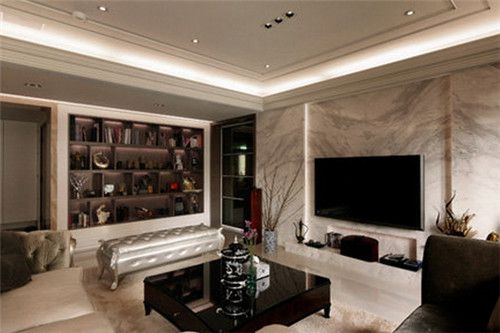 客廳內(nèi)力與美兼?zhèn)涞碾娨曋鲏Γ冒咨y狐石材的光潔潤澤質(zhì)感,盡管立面兩側(cè)有著階段性落差以便內(nèi)嵌燈光,整體視覺上依然能保有大面積優(yōu)美絕倫的紋理對花,下方延續(xù)一氣呵成的內(nèi)縮視聽低臺,緊致的結(jié)構(gòu)張力,成為最能彰顯獨(dú)特美感與生活機(jī)能的利落手法。