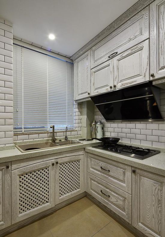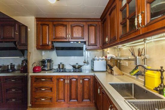 在廚房使用大量的木制品時,應注意廚房的通風與換風系統的完善,避免水汽長期聚留在地板與墻面上,使木制品開裂變形,甚至腐爛。廚房的窗簾在選擇上應采用鋁合金烤漆鍍膜的百葉窗,盡量不要使用布藝窗簾,避免在沾染油污后不易清理。