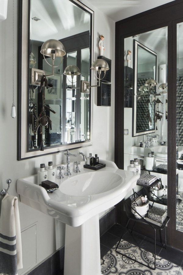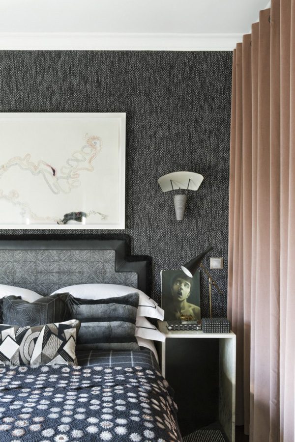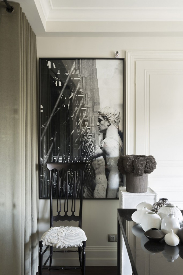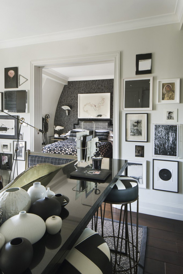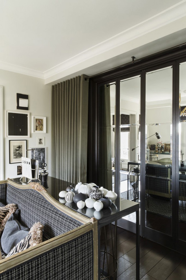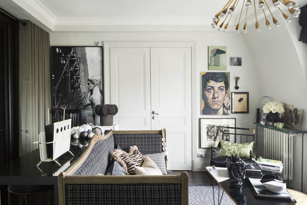 這座內容豐富的公寓位于法國巴黎,設計師 Hubert Zandberg 以黑白色調為基底,用大量的裝飾品去填充整個空間。保留原先的弧形墻面,讓空間自帶優雅與柔美的氣息,深色的木質地板上鋪設花灰色地毯,黑白格紋的沙發以木條包邊,帶來極為質感的紳士品味,茶幾與座椅全部選用了黑色調,為了避免小空間的暗淡乏味,保留的潔白墻面可以調和室內的色度,少面積的黃銅元素點綴,提升華麗感,豐富的藝術品從素色的裝飾畫到精致的擺設,幾乎占滿了空間的所有角落,也正因為這些小飾物,為略顯擁擠的公寓帶來更多的驚喜,視線隨著轉移,絲毫不會感到無趣。