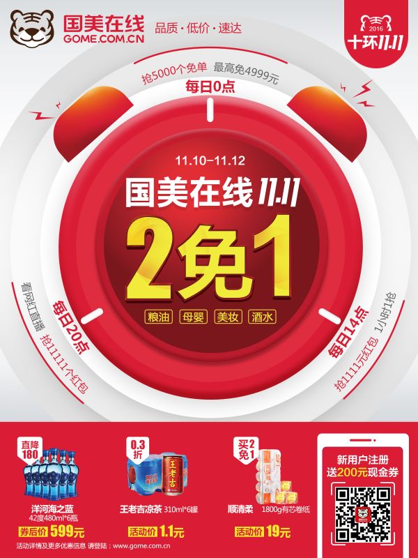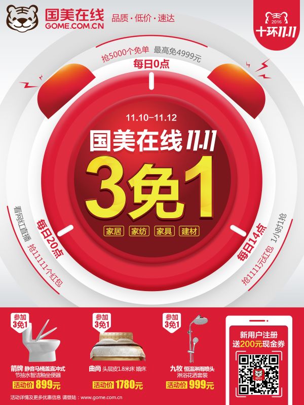 11月5日起,北京、上海、廣州、深圳、成都、南京、武漢、重慶、西安、天津等城市的電梯間陸續(xù)出現(xiàn)國美在線“十環(huán)”廣告海報,相比友商大玩明星、晚會等噱頭,國美在線推出品質(zhì)、低價、速達3個十環(huán)承諾,低價十環(huán)推出三大福利,主要有11月10日-11月12日每日0點搶5000個免單最高免4999元、每日14點開搶1111元紅包,1小時1搶,每日20點看網(wǎng)紅直播,搶11111個紅包。國美在線還有史上超大力度的三大品類鉅惠,家電3C類國美在線雙11真5折、 家居 建材買3免1、糧油酒水類買2免1等等。如創(chuàng)維42英寸智能網(wǎng)絡(luò)電視活動價僅需1111元,5折的優(yōu)惠力度讓你立省998元;箭牌靜音馬桶、曲尚婚床、九牧淋浴花灑套裝分別打出899元、1780元、999元的超值鉅惠冰點價,并且全部參加買3免1。