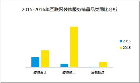京東大數據顯示,在2016年(1-8月)互聯網裝修服務銷量品類占比中,排名前三位的分別是裝修施工、裝修設計和安裝服務。其中用戶對于局部改造、裝修施工的需求同比大增。