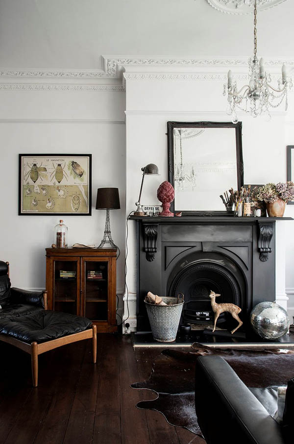 起居室的天花板上有美麗的石膏造型,精致的復古吊燈,很酷的黑色木地板和一個時尚的黑色壁爐,將現代和復古融合在一起。家具是黑色的:一個皮革沙發,躺椅和一臺放在老式木制柜中的電視。人造毛皮和針織衫使空間更加舒適。