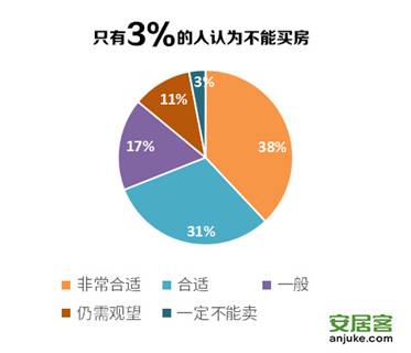 另據安居客房產指數報告,近七成人認為現在購房時間適合,另有11%的人表示要觀望,僅有3%的人群認為一定不能買房。