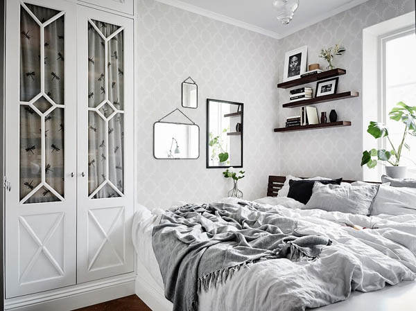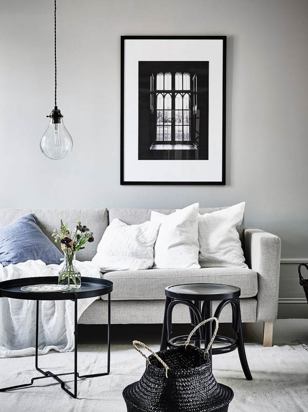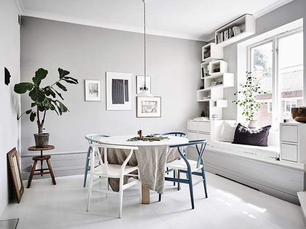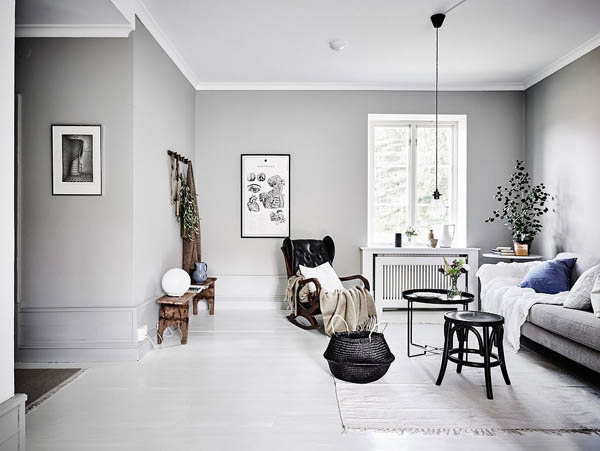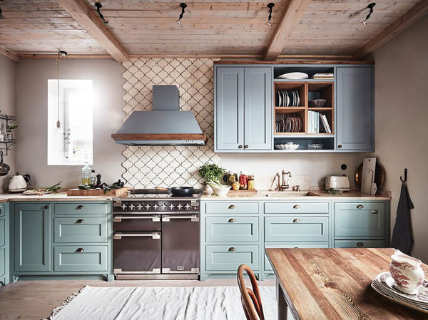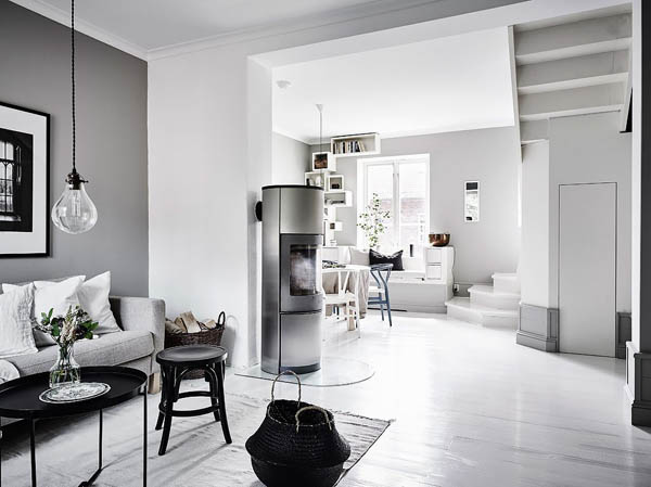 公寓客廳有著淺灰色的墻壁,白色的地板和簡約的設(shè)計,典型的斯堪的納維亞風(fēng)格的空間。但是,當(dāng)你移動到廚房里,你會突然發(fā)現(xiàn)自己身處法國的木質(zhì)天花板和藍色復(fù)古外觀櫥柜之間。