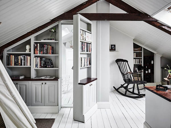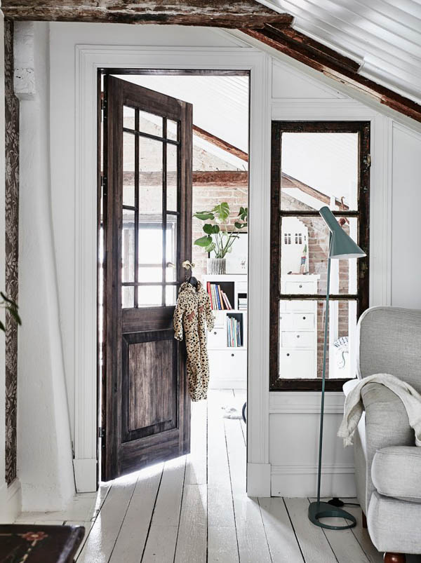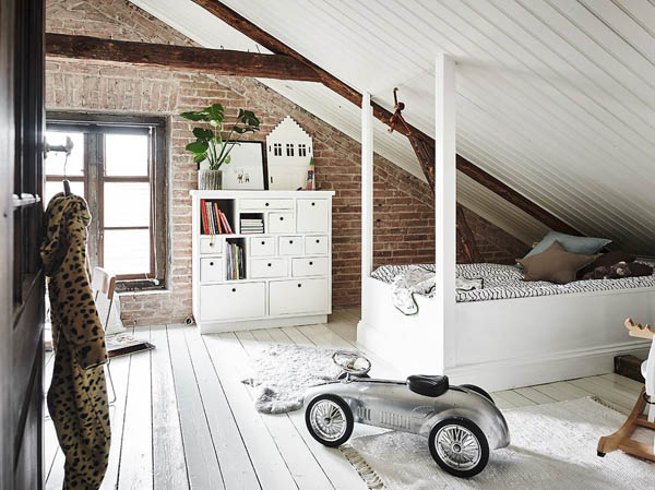 來到閣樓空間,你又會回到斯堪的納維亞設(shè)計之中,這里的舊英式建筑的骨骼——裸露在外的橫梁和磚墻可見。閣樓空間中最好的設(shè)計可能就是通向兒童房的“隱形門”了(這幾乎是每個孩子的夢想。)