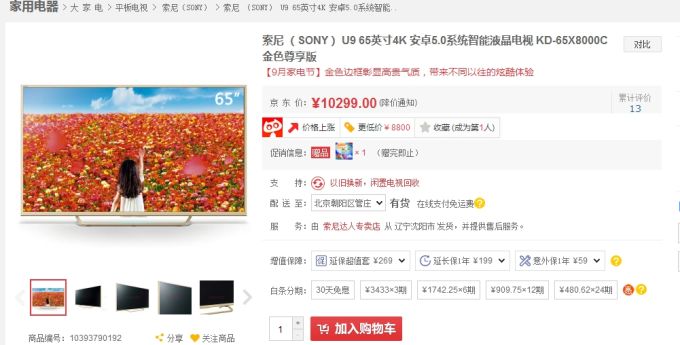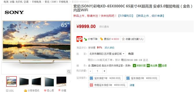 國美在線售價9999元,京東售價10299元,比京東低300元。
