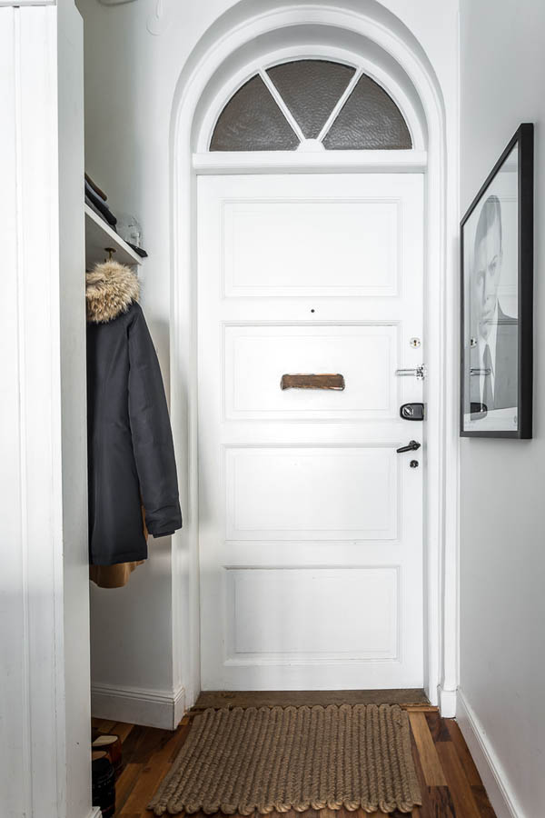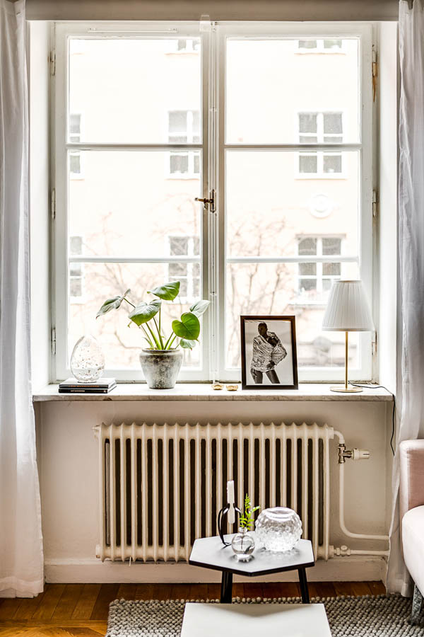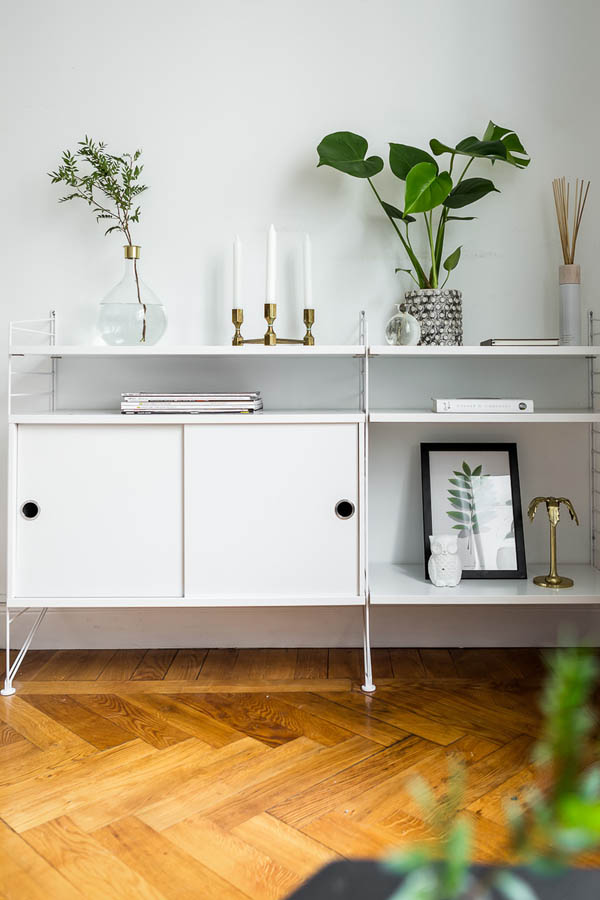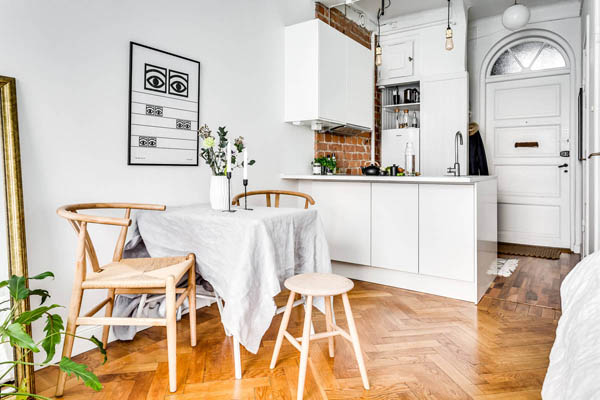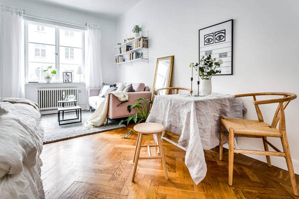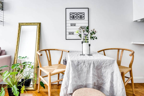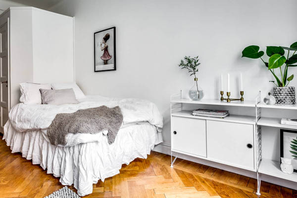 這間公寓選擇將主要活動(dòng)空間圍繞屋內(nèi)的窗戶展開,起居,臥室,餐區(qū)都在此處(PS,好像也沒有別的地方可去)。好的陽光要給閱讀。于是沙發(fā),書架(String®)因此而生。餐區(qū)一張桌子,兩把Y椅,墻面Olle Eksell 的大眼裝飾畫,全是藝術(shù)品。桌面花瓶+燭臺(tái),是為了調(diào)節(jié)情調(diào)和帶來春意。