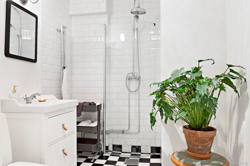 衛(wèi)生間采用同樣的黑白磚鋪設(shè)地面。
