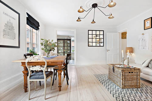 餐區(qū)被融合進(jìn)客廳。復(fù)古的餐桌搭配同樣年代的椅子,給了室內(nèi)懷舊的氛圍。