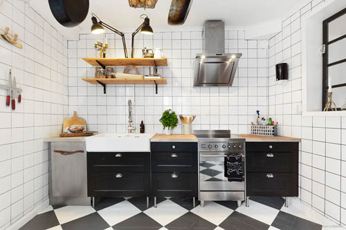 廚房選用黑白地磚鋪設(shè)地面,這就給該區(qū)域定下了黑白的基調(diào)。墻面是小方磚鋪墻。銀色的冰箱與黑白對比起來顯得熠熠生輝。
