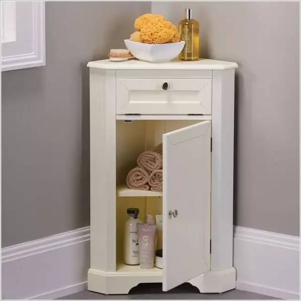【廁所收納】▲轉角的小矮柜既能收納又能擺放,常用的沐浴工具放在臺面上,儲存的大瓶沐浴露可以收進柜子里。