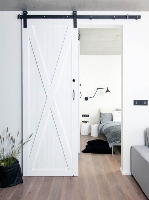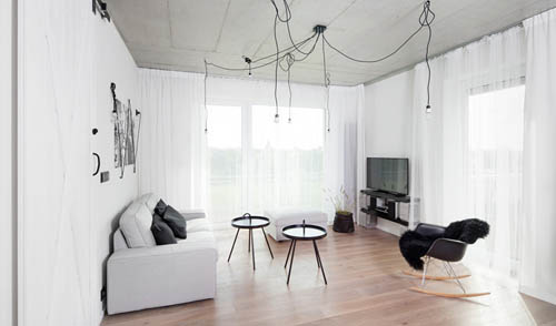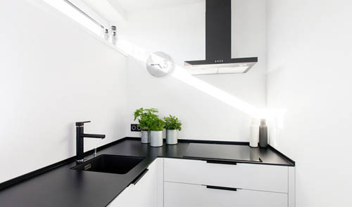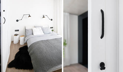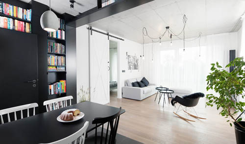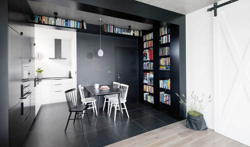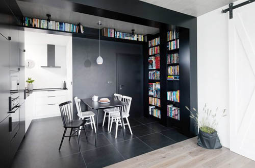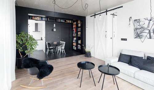 捷克室內設計公司 SMLXL 運用黑色與白色兩種強烈對比的特性,在開放式公共空間創造出仿佛兩間屋子的錯覺。靠近陽臺落地窗的客廳區域設定為全白的樣貌,從紗簾、墻面到谷倉滑門都是一片雪白;進入餐廚空間則改為全黑主題,從地面磁磚、書柜到電器柜一片黝黑,換個視角就像是換個屋子一般奇妙。
