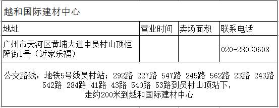 關于企業:越和國際建材中心,雄踞于廣州建材商圈(黃埔大道)龍頭位置,交通快捷便利。云集科勒、TOTO、摩恩、九牧廚衛、TATA木門、大將軍陶瓷、新中源陶瓷、蒙娜麗莎瓷磚、大自然地板、東方美御門業、金舵陶瓷、德派中央衣櫥、東亞吉祥門等100多家國內外高檔建材品牌。商場占地2萬多平方米,場內全新現代化高檔裝修,通道寬敞明亮、購物環境舒適,配套設施齊全且完善,是目前廣州天河頗具影響力的一家高檔成熟建材中心。