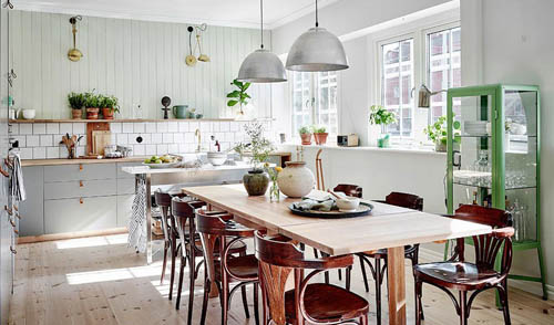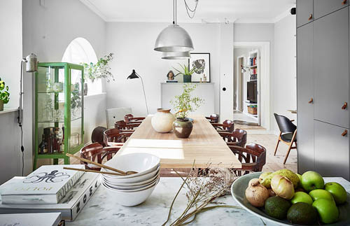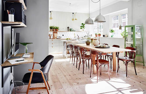 廚房是親朋好友們的歡聚場(chǎng)所,一張長型木桌絕對(duì)必要,將復(fù)古味餐椅結(jié)合摩登燈具,搭配多樣蔥郁盆景呼應(yīng)選用嫩綠色做為主調(diào)的巧妙構(gòu)思,仿佛踏進(jìn)花園般心曠神怡。用餐區(qū)結(jié)合工作室的混搭使用越來越普遍,很多人選擇將餐桌當(dāng)作辦公桌,但考量工作時(shí)可能會(huì)需要參考書籍資料,擺放在餐桌上有時(shí)就顯得不太方便,也可能干擾到其它人用餐,可以參考這間公寓在角落利用簡(jiǎn)單層架加上木板就能完成工作區(qū),餐桌不夠大也不用擔(dān)心。
