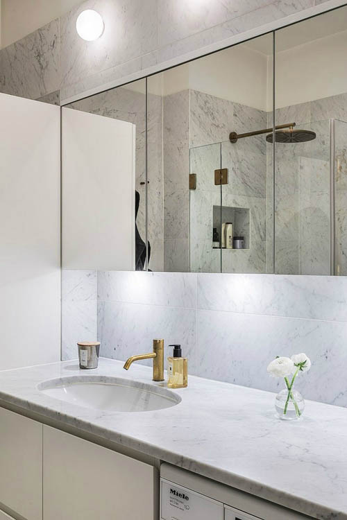 空間當(dāng)中也配了一些小驚喜,比如在走廊上掛著一張大型和一張小的正方形照片,或者在主臥室配有灰色的床頭板和窗簾,平靜的灰褐色墻壁和床邊的毯。交替仿大理石和木地板讓外觀更加整潔。擺在正確位置的圓形鏡子和藝術(shù)品也不會影響整體!