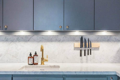 廚房里,黑色的廚房桌椅和藍色的櫥柜占據(jù)了房間。白色墻壁形成反差,但是較淺的藍色櫥柜在光線和黑暗之間提供了很好的平衡。平滑的白色和灰色的大理石臺面使得臺面上的葡萄酒顯得更精致。桌子上方有三根細長的金色吊燈,金色旋鈕,金色水槽和一張框架裝飾畫,提升了空間品質(zhì)感,并且讓室內(nèi)顯得更輕。