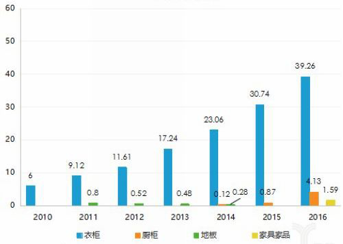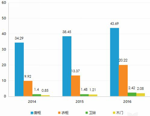 除了索菲亞,衣柜領域如好萊客、頂固集創等也遇到了類似的困境。櫥柜行業如歐派 家居 ,2016年業務總營收為71.34億元,櫥柜業務收入43.69億元,衛浴和木門總占比6.31%,衣柜業務發展較為可觀,占比28.34%。同樣皮阿諾、我樂 家居 等以櫥柜發家的企業,櫥柜業務仍占主要比例,在此就不一一列舉。