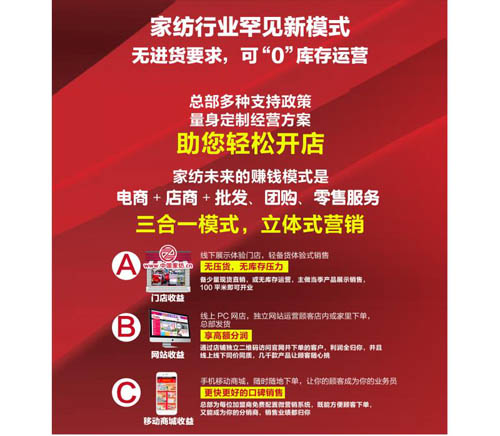 目前在全國各地的實體店,生意也是越來越好。中國家紡設計的加盟體系也真正幫助了加盟商們賺到了錢。加盟中國家紡,只需要100平方米的店,就能達到2000平方米商城的經營效果。加盟商只開一個店就能做一個城市的生意。因為只要是通過加盟店發展的會員,不管任何時候購買,利潤分成都是給到加盟店的。并且加盟店可以開發微代理,只要1個平方就可以成為微代理商。曹清把這種模式叫做八爪魚模式,一個主體加上更多的觸角去接觸消費者,開發更多的會員。會員在中國家紡上面任何消費,加盟商都能拿到分成,而且還不用壓貨。