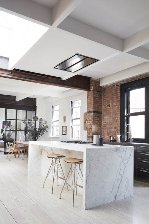 從原有建筑,到現(xiàn)在的粉刷橡木地板和裸磚,再到光滑的大理石和不銹鋼廚房,有很多值得借鑒的