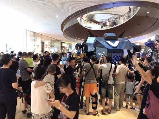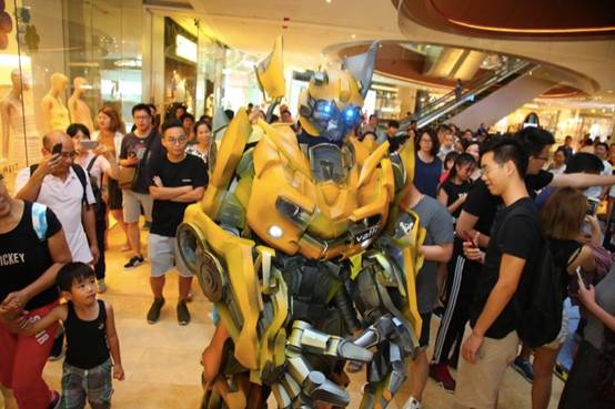 2017年7月1日,就在《變形金剛5:最后的騎士》的第二個周末,在廣州最熱鬧的天河商圈的頂級購物中心——太古匯,出現了一架本來只應該出現于電影里的賽博坦星飛船,同時出現的還有“主角”擎天柱與大黃蜂,而這一切立刻引起了在場顧客的強勢圍觀,而當大黃蜂動起來時更是點燃了現場的熱情,求拍照求互動的隊列排出了很長,更有甚者直呼:比電影更好玩!