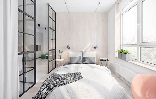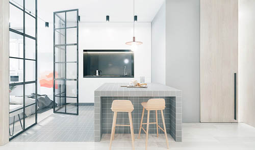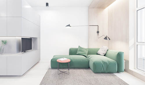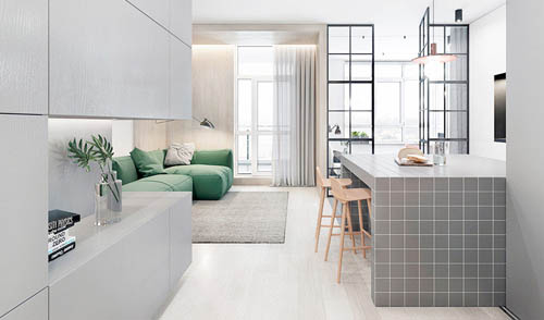 開放式居家越來越流行,甚至可說是放大小面積首選技巧之一,但在完成之前打掉隔間墻絕對無法避免,但這同時也突顯了這種布局規(guī)劃中「沒有隱私性」的缺點。俄羅斯這間簡約公寓由當?shù)厥覂?nèi)設(shè)計工作室Lugerin Architects規(guī)劃,簡約風格中帶著清亮北歐氛圍,純白空間搭配高比例淺灰色襯托空間質(zhì)感,公共區(qū)域用一席清新綠沙發(fā)作為跳色,同時達到聚焦視覺作用,讓人一進門就不由自主地往客廳走去,順著視線往前看的不是電視,而是餐廚區(qū),視覺動線上的這種設(shè)計讓家人間互動更為自然直接。