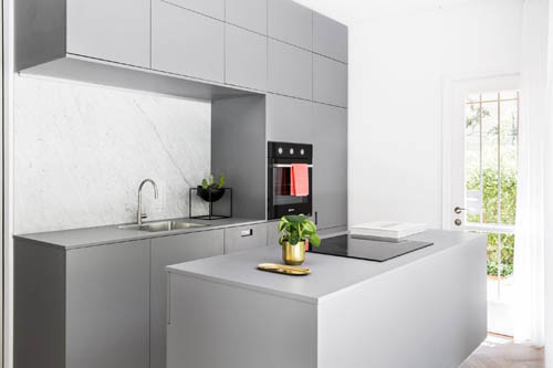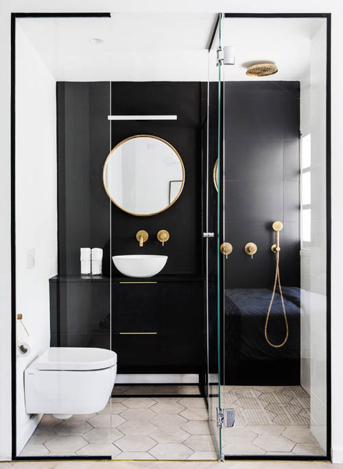 設計師解釋說:“我們希望提供較深的對比度,而又不會讓空間顯得封閉。 你可以在灰色的廚房里,黑色的連接浴室(以金色做焦點色)看到這種設計,黑色的人字形瓷磚地板則用在第二個浴室里。”