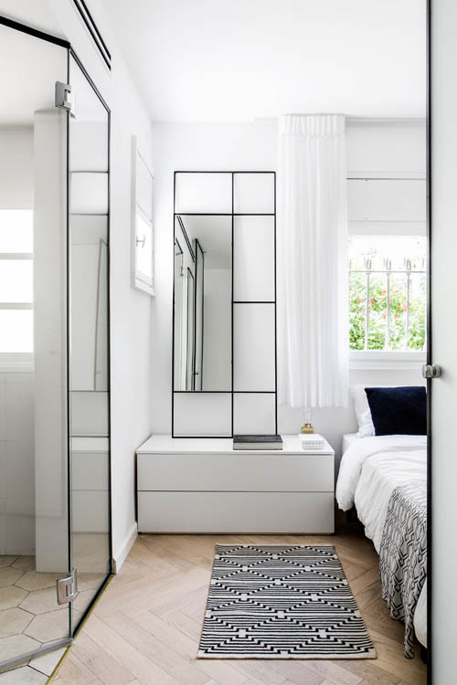“由于尺寸非常重要,我們選擇購買少量物品和定制設計,包括櫥柜,貨架,床邊單元,鏡子等,”設計師說。