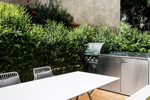 室外,花園的地板更換以搭配建筑物的外窗,并安裝了綠植墻,在提供鮮活氛圍的同事,又不占用寶貴的占地面積。