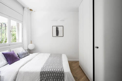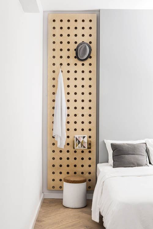 為了節省空間,衣柜在臥室和客廳之間被做成墻壁的一部分,而半透明的玻璃門讓光線可以在起居室之間流動。
