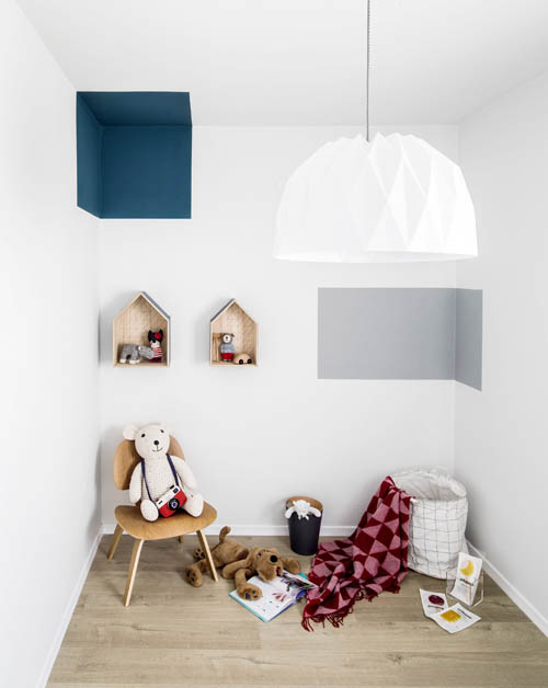 該公寓是由一對年輕的夫婦和一個孩子居住,所以佩里平衡區域讓他們能夠一起度過娛樂時間 – 比如一個大型模塊化沙發和餐廳的起居區 – 在公寓的較小的空間,被定制為微型游樂區。