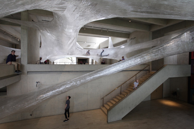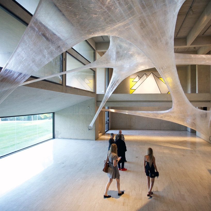 通過運用膠帶這種既新奇又普遍的材料,創作出大型的裝置作品,本次展覽希望探索線條和空間的概念。對來自維也納和薩格勒布的的numen/for use來說,他們對des moines藝術中心野獸派的建筑表面和富有表現力的幾何圖形非常感興趣,于是在貝聿銘畫廊里創作了這個輕便、半透明的裝置作品,和四周冰冷的建筑空間形成了強烈的對比。
