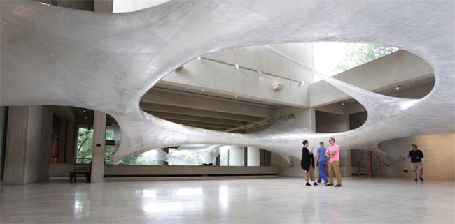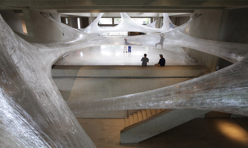 “寄宿在這樣一個重量級的宿主體內,這樣的寄生蟲裝置就代表著建筑物實際的空間范圍。”numen/for use在他們的網站上這樣寫道,“它允許游客們在里面順著它的線路移動,自己本身也會隨著游客的移動軌跡而發生變化,這一切只在一個由膠帶構成的懸空密閉、超現實的空間里發生。”
