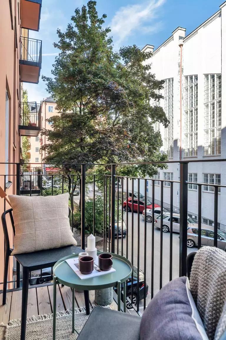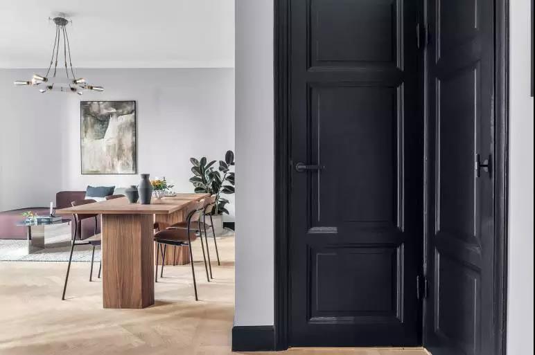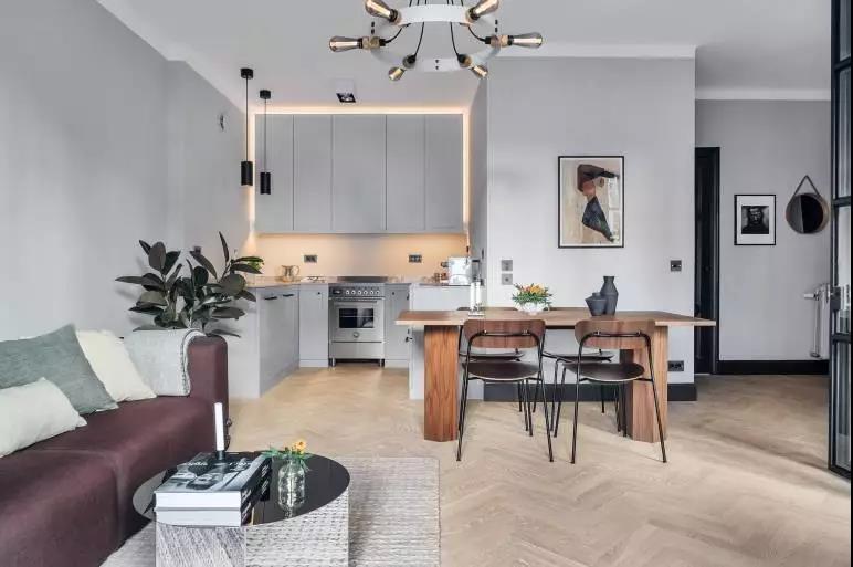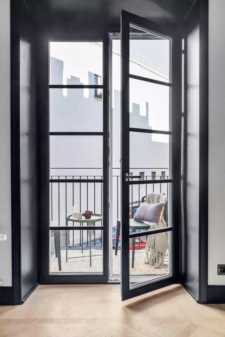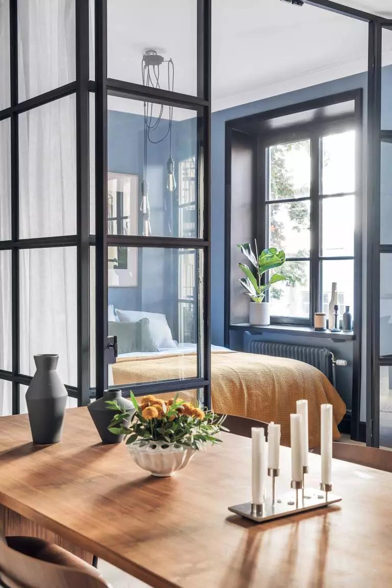 這間公寓利用玻璃墻在視覺上將白天與夜晚分開,而且臥室的淺藍色飾面,與灰色色調和室內其他部分使用的木材形成鮮明對比。