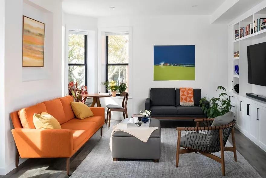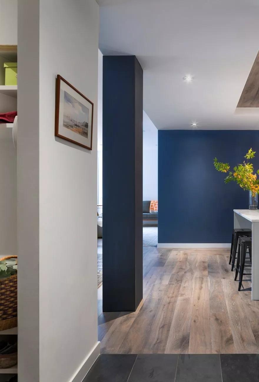 公寓的私人空間沿著長長的藍灰色墻壁。主臥室增加了一個新浴室,兩個浴室均采用淡藍色和灰色調。