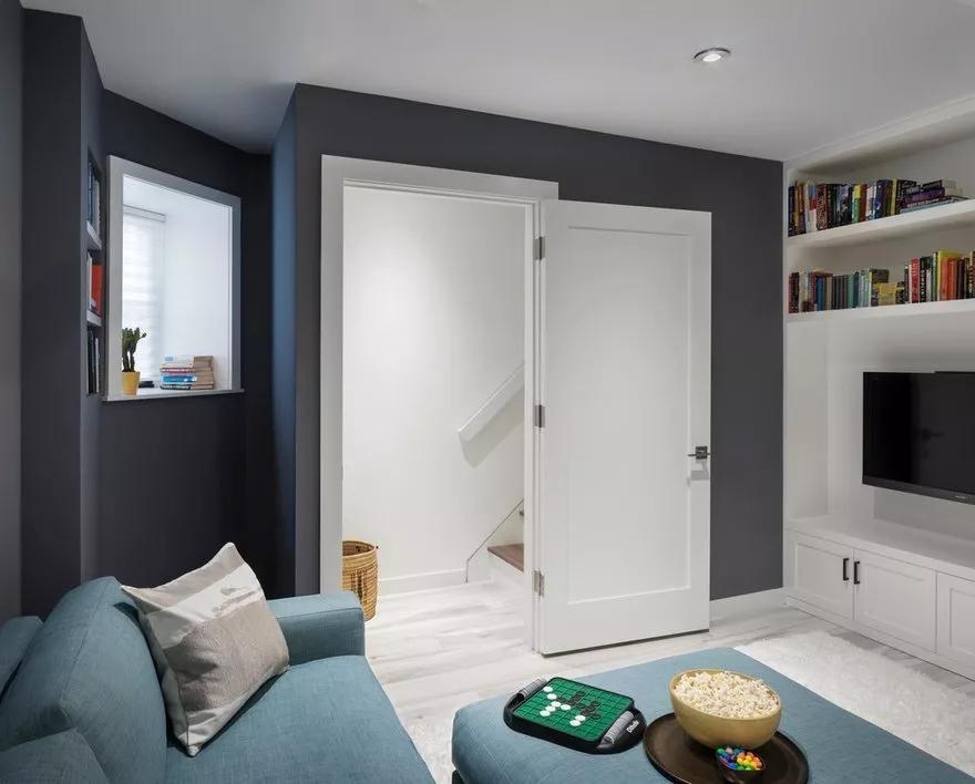 樓下的家庭活動室設有內嵌擱架,可供觀看電影以及洗衣和存放區。