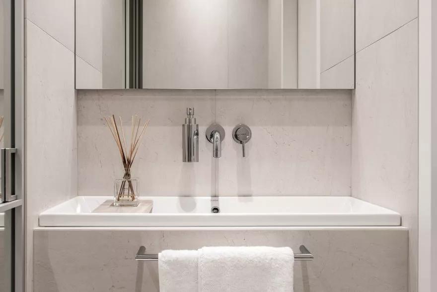 在客廳和臥室的某些墻壁上選擇了石灰華石。淺粉白色橡木鑲木地板在客房的地板上增添了溫暖。瓷磚也保持溫暖的色調。整個公寓的底部都嵌入了墻壁。這種工藝有助于清潔室內。