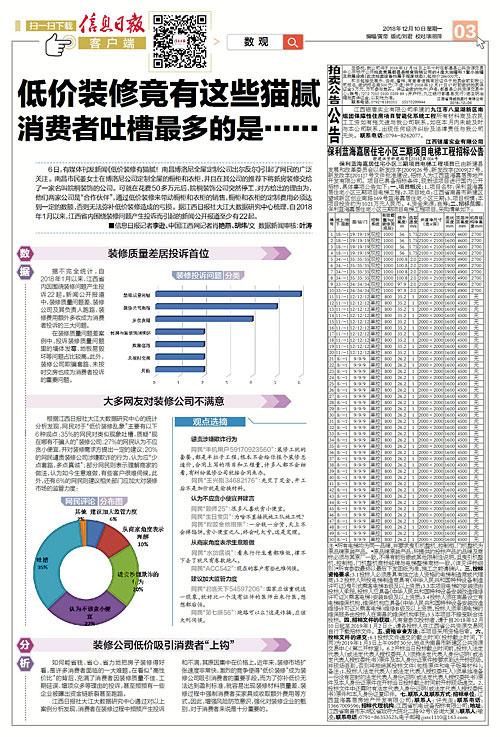 江西日報社大江大數據研究中心通過對以上案例分析發現,消費者在裝修過程中頻頻產生投訴和不滿,其原因集中在價格上。近年來,裝修市場擴張速度非常快,激烈的競爭使得“低價裝修”成為裝修公司吸引消費者的重要手段。而為了彌補低價無法達到盈利標準,就容易出現裝修材料質量差、裝修過程中強制消費者買家具或收取額外費用等方式。因此,增強風險防范意識,強化對裝修企業的甄別,對于消費者來說是十分重要的。