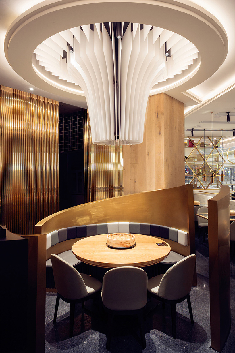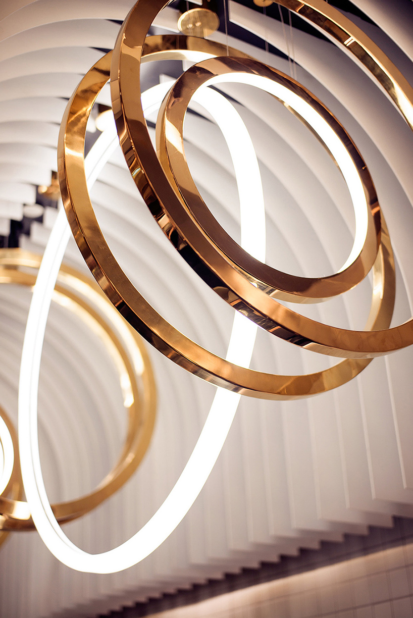 設計概況:空間整體由曲線和直線線條構成,設計師巧妙地利用燈光效果,搭配金屬質感的圓環裝飾,打造出一種燈火闌珊的視覺體驗。