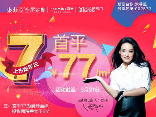 據悉,除了此首平77元促銷活動以外,北京索菲亞全屋定制喜迎上市7周年慶推出多重優惠活動,包含勁爆套餐、專享特價、勁爆大禮、秒殺饋贈、多重優惠好禮又驚艷了整個北京城。