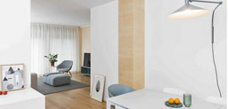 從入戶至公共領域空間,整體通鋪木質地板,簡單吊頂,客廳采用無主燈設計,主要以點光源作空間照明,簡潔利落。